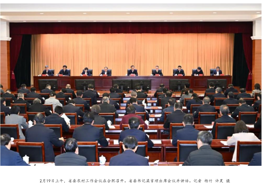 2月19日上午,省委農(nóng)村工作會議在合肥召開。省委書記梁言順出席并講話。他強調(diào),要深入貫徹總書記關(guān)于“三農(nóng)”工作的重要論述和考察安徽重要講話精神,堅定扛起“三農(nóng)”工作時代重任,干字當(dāng)頭、創(chuàng)先爭優(yōu),在推進鄉(xiāng)村全面振興上走在前列。省委副書記、省長王清憲主持會議。省政協(xié)主席唐良智,省領(lǐng)導(dǎo)費高云、孫紅梅、單向前、陶明倫、孫勇、張祥安出席,副省長張曙光作具體部署。