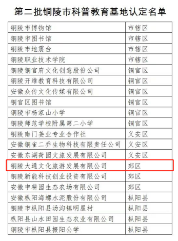 喜訊!銅陵大通文化旅游發(fā)展有限公司榮獲“銅陵市科普教育基地”!