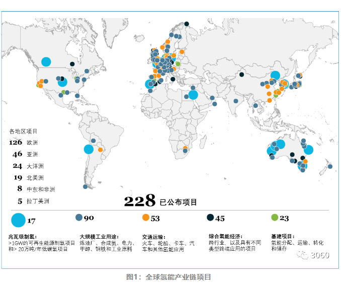 根據(jù)國(guó)際氫能委員會(huì)統(tǒng)計(jì),在全球范圍內(nèi),氫能產(chǎn)業(yè)鏈目前已有228個(gè)已建、在建及規(guī)劃項(xiàng)目(見(jiàn)圖1)。其中,有17個(gè)是已公開(kāi)的兆瓦級(jí)綠氫生產(chǎn)項(xiàng)目(即>1GW可再生能源和>20萬(wàn)噸/年的低碳?xì)洚a(chǎn)能項(xiàng)目),主要分布在歐洲、澳大利亞、亞洲、中東、智利等國(guó)家和地區(qū)。
