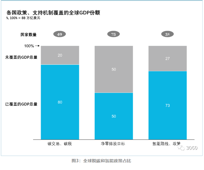全球各國(guó)政府已投入總計(jì)約700億美元,用以支持氫能戰(zhàn)略。由于全球脫碳化進(jìn)程的加快,越來(lái)越多的國(guó)家提出發(fā)展氫能:占世界GDP總量50%的75個(gè)國(guó)家已提出凈零排放目標(biāo),占世界GDP總量80%的國(guó)家出臺(tái)二氧化碳定價(jià)機(jī)制(見(jiàn)圖3)。