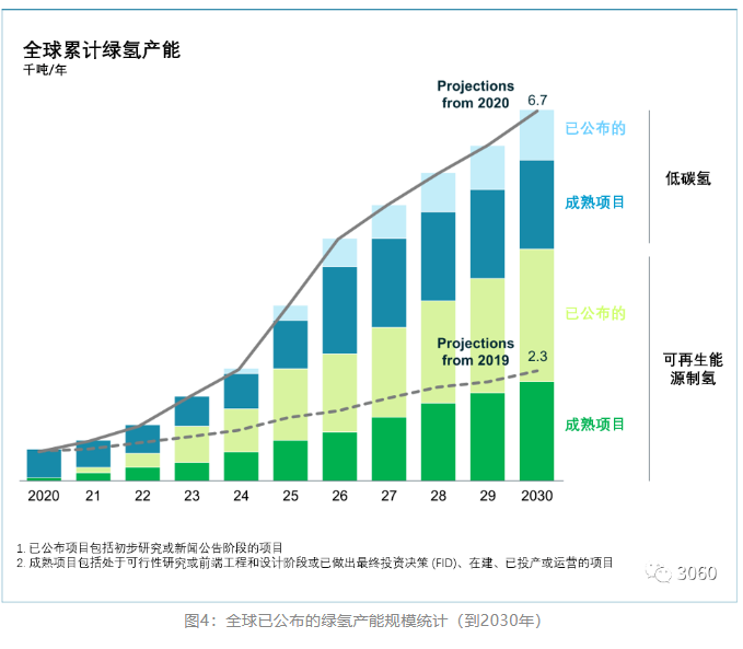 由于對(duì)氫能的日益關(guān)注和各國(guó)政府支持的增加,全球已公布的2030年綠氫的年產(chǎn)能從之前的230萬(wàn)噸增加至670萬(wàn)噸(見(jiàn)圖4)。