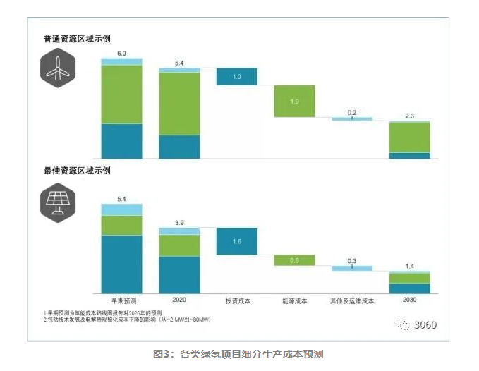 例如中歐的海上風(fēng)電制氫項(xiàng)目(或同類普通資源的綠氫項(xiàng)目),制氫成本將從2020年的5.4美元/公斤下降到2030年的2.3美元/公斤,其中LCOE的下降對(duì)綠氫成本的影響最大。由于電力成本的相關(guān)性更高,擁有低成本可再生能源的地區(qū),綠氫降本趨勢(shì)也將更快。而例如中東的光伏制氫項(xiàng)目(或同類低成本可再生能源制綠氫項(xiàng)目),到2030年,制氫成本將下降到1.5美元/公斤。在這種情況下,與海上風(fēng)電制氫項(xiàng)目相比,電解槽投資成本的下降對(duì)推動(dòng)綠氫成本下降的影響更大。