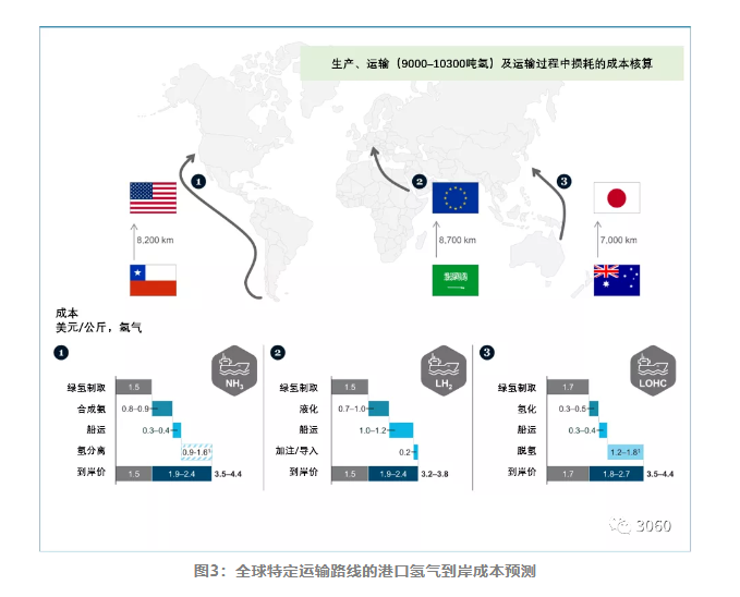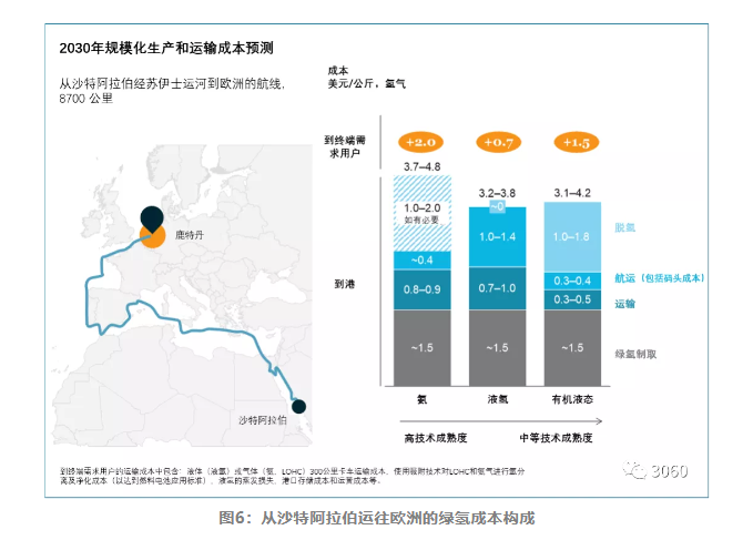 如果目的地需要液態(tài)或高純度氫氣,液氫儲(chǔ)運(yùn)的效率最高。與氨和有機(jī)液態(tài)氫相比,液氫無(wú)需脫氫或裂解即可轉(zhuǎn)化為氫氣,不僅節(jié)省成本,且無(wú)需提純。液氫的主要缺點(diǎn)是體積能量密度相對(duì)較低,限制了船運(yùn)的載氫量,同時(shí)儲(chǔ)運(yùn)過(guò)程中會(huì)有蒸發(fā)損失。雖然液氫儲(chǔ)運(yùn)是一種經(jīng)過(guò)驗(yàn)證和商業(yè)化的技術(shù),但大規(guī)模液氫儲(chǔ)運(yùn)仍處于試運(yùn)營(yíng)階段;氨擁有比液氫更高的體積能量密度,因此以氨的形式運(yùn)輸比液氫儲(chǔ)運(yùn)更具經(jīng)濟(jì)行。但氨后續(xù)裂解成氫的成本較高,且可分離的氫純度較低。此外,由于氨具有毒性,所以在特定區(qū)域會(huì)有儲(chǔ)運(yùn)限制;液態(tài)有機(jī)儲(chǔ)氫可以應(yīng)用現(xiàn)有的柴油基礎(chǔ)設(shè)施,長(zhǎng)期安全儲(chǔ)存氫,且不會(huì)發(fā)生損耗。但LOHC的主要缺點(diǎn)是脫氫過(guò)程需要大量的熱量,且與液氫和氨相比載氫能力有限。(圖6預(yù)測(cè)了2030年從沙特阿拉伯向西歐運(yùn)輸綠氫的三種儲(chǔ)運(yùn)成本構(gòu)成情況,包括制氫成本,到岸價(jià)格在3-5美元/公斤。)