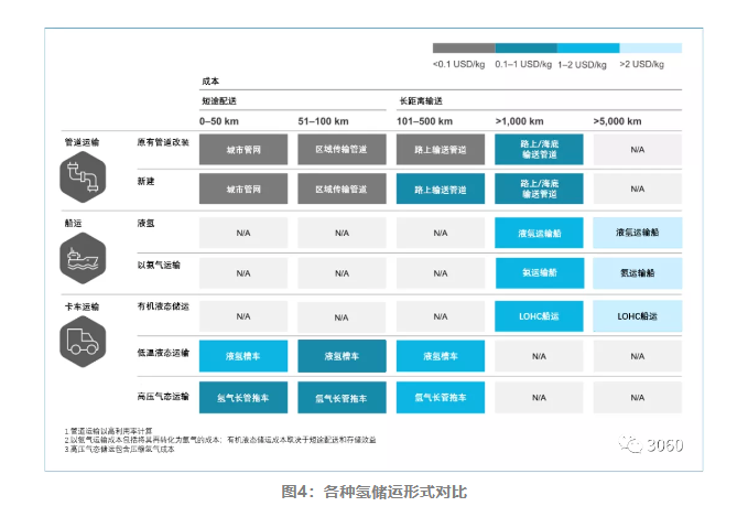 氫可以通過(guò)三種運(yùn)輸載體(管道、輪船或卡車)以多種形態(tài)在全球范圍內(nèi)儲(chǔ)運(yùn)(氫氣、液氫、有機(jī)液態(tài)氫﹝LOHC﹞、氨、甲醇、LNG/LCO2﹝去程運(yùn)載液化天然氣、回程運(yùn)載液態(tài)CO2的兩用船﹞和固態(tài)儲(chǔ)氫)。全球各地氫儲(chǔ)運(yùn)方式需要綜合運(yùn)輸距離、地理位置和終端應(yīng)用等因素來(lái)決策最佳的儲(chǔ)運(yùn)解決方案。