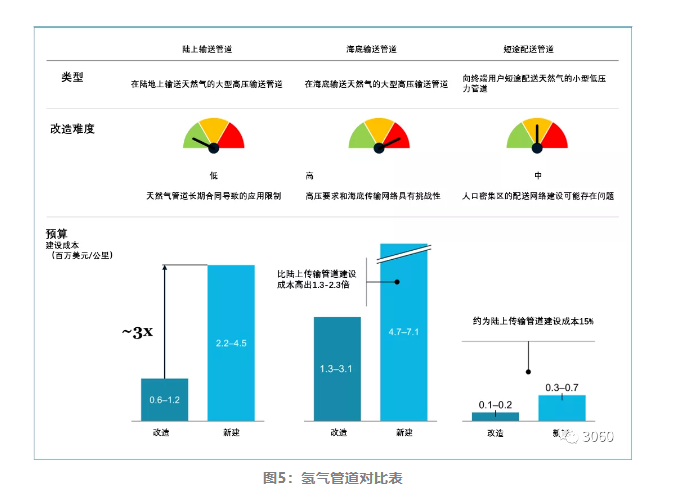 根據(jù)目前的項(xiàng)目來(lái)看,陸上氫氣管道的改造成本約為60-120萬(wàn)美元/公里,新建管道成本約為220-450萬(wàn)美元/公里;對(duì)于海上/海底氫氣管道,根據(jù)新建或改造的具體條件和建設(shè)難度,成本要比陸上管道高出1.3到2.3倍;而短途配送管道由于其較小的管徑和較低的壓力要求,建設(shè)和改造成本比傳輸管道便宜得多(大約只占傳輸管道成本的15%),但只有未來(lái)住宅和商業(yè)建筑對(duì)氫氣的需求超過(guò)天然氣摻氫臨界值(20%)的情況下,短途配送管道的大規(guī)模建設(shè)才具有經(jīng)濟(jì)性。(見(jiàn)圖5)