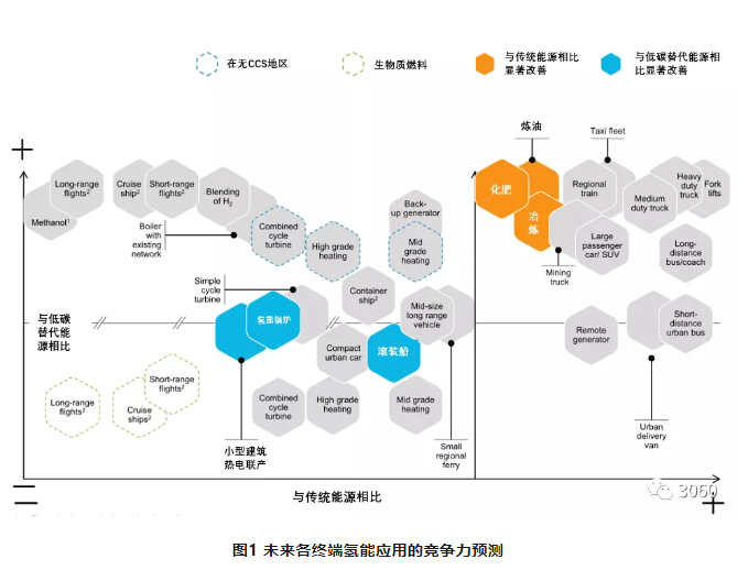 在國(guó)際氫能委員會(huì)(Hydrogen Council)在《氫能洞察》報(bào)告中,梳理預(yù)測(cè)了未來(lái)各領(lǐng)域氫能應(yīng)用與傳統(tǒng)能源和低碳替代能源的競(jìng)爭(zhēng)力對(duì)比。從總體擁有成本(TCO)的角度來(lái)看,在全球制氫、儲(chǔ)運(yùn)、配送成本快速下降的趨勢(shì)下,氫能在各領(lǐng)域的應(yīng)用潛力將逐步凸顯,到2030年,氫能可在22種終端應(yīng)用中成為最具競(jìng)爭(zhēng)力的減碳解決方案,包括煉油、化肥、商用車、長(zhǎng)途卡車運(yùn)輸、航運(yùn)和氫冶煉等應(yīng)用領(lǐng)域。(見(jiàn)圖1)。