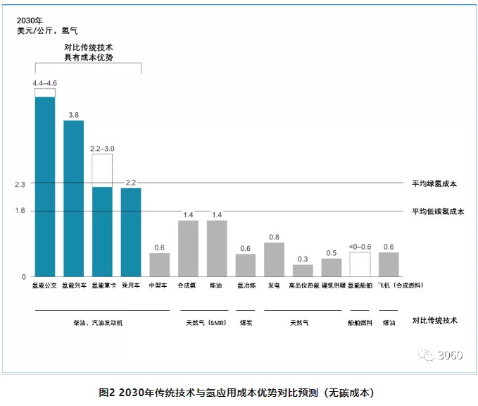交通運(yùn)輸方面,到2030年,燃料電池汽車(FCEV)可在不考慮碳排成本的情況下比多數(shù)傳統(tǒng)運(yùn)輸方案有競(jìng)爭(zhēng)優(yōu)勢(shì),特別是在重型卡車和遠(yuǎn)程運(yùn)輸領(lǐng)域。在重載長(zhǎng)距離運(yùn)輸中,如果加氫端價(jià)格達(dá)到4.5美元/千克(包括制氫、儲(chǔ)運(yùn)和加氫成本),F(xiàn)CEV方案可在2028年實(shí)現(xiàn)與柴油車同價(jià)。CCTC®此外,燃料電池在功率和續(xù)航時(shí)間要求非常高的領(lǐng)域(如重型礦用卡車等)提供了一種可行的替代方案。
