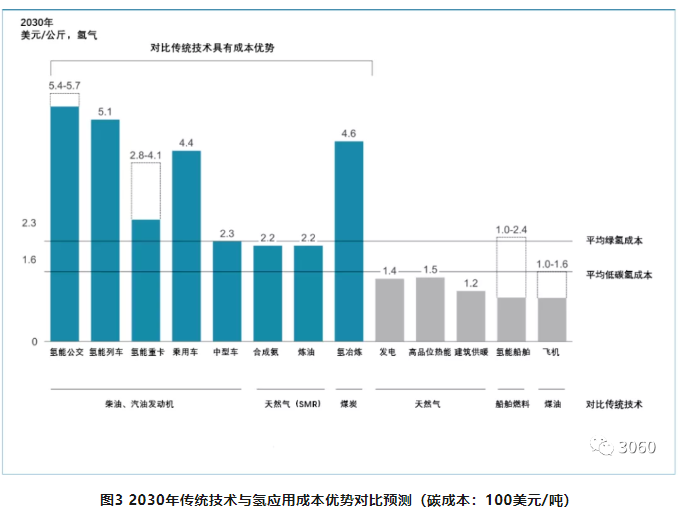 根據(jù)2030年各領(lǐng)域中傳統(tǒng)技術(shù)與氫應(yīng)用成本對(duì)比預(yù)測(cè)(見(jiàn)圖2),可以看到,以1.6-2.3美元/千克的氫能終端應(yīng)用成本計(jì)算,在不考慮碳排成本的情況下,氫能僅在大型公路運(yùn)輸應(yīng)用(不包括乘用車)方面具有競(jìng)爭(zhēng)力。若增加各領(lǐng)域碳排放成本(以100美元/噸CO2計(jì)算),氫能將在大多數(shù)道路運(yùn)輸和工業(yè)應(yīng)用中具有顯著的成本優(yōu)勢(shì)(見(jiàn)圖3)。
