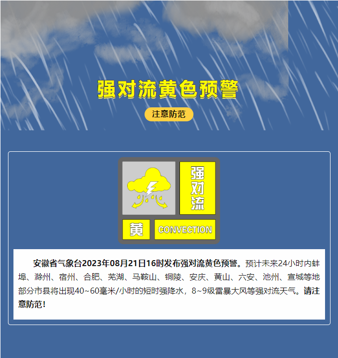 安徽省氣象臺2023年08月21日16時發(fā)布強對流黃色預(yù)警
