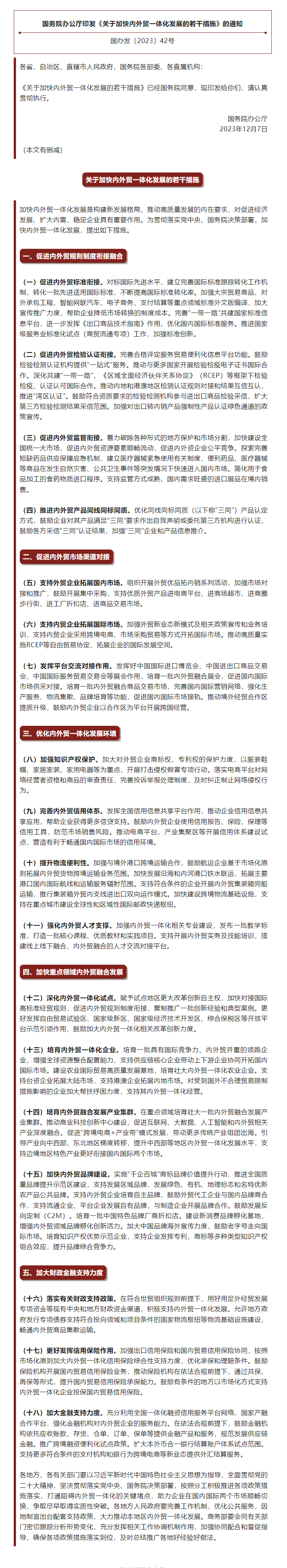 國(guó)務(wù)院辦公廳印發(fā)《關(guān)于加快內(nèi)外貿(mào)一體化發(fā)展的若干措施》的通知