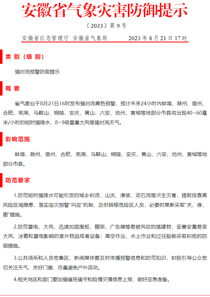 安徽省氣象臺(tái)2023年08月21日16時(shí)發(fā)布強(qiáng)對(duì)流黃色預(yù)警